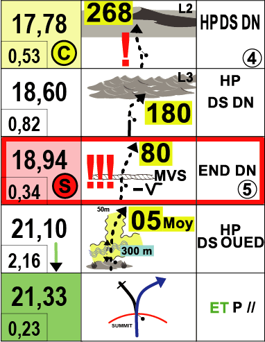 - Beware. At kilometre 18.94, 340m since the last entry, you have to hit a security checkpoint bang on. Maximum [three-exclamation-mark] alert!!! When you come out of the dunes [‘END DN’], a barely visible ditch is lying in wait on a bad track. [MVS is an abbreviation of the French word mauvais.] Once you’re beyond that, you carry on into a gentle right turn at a bearing of about 80°.