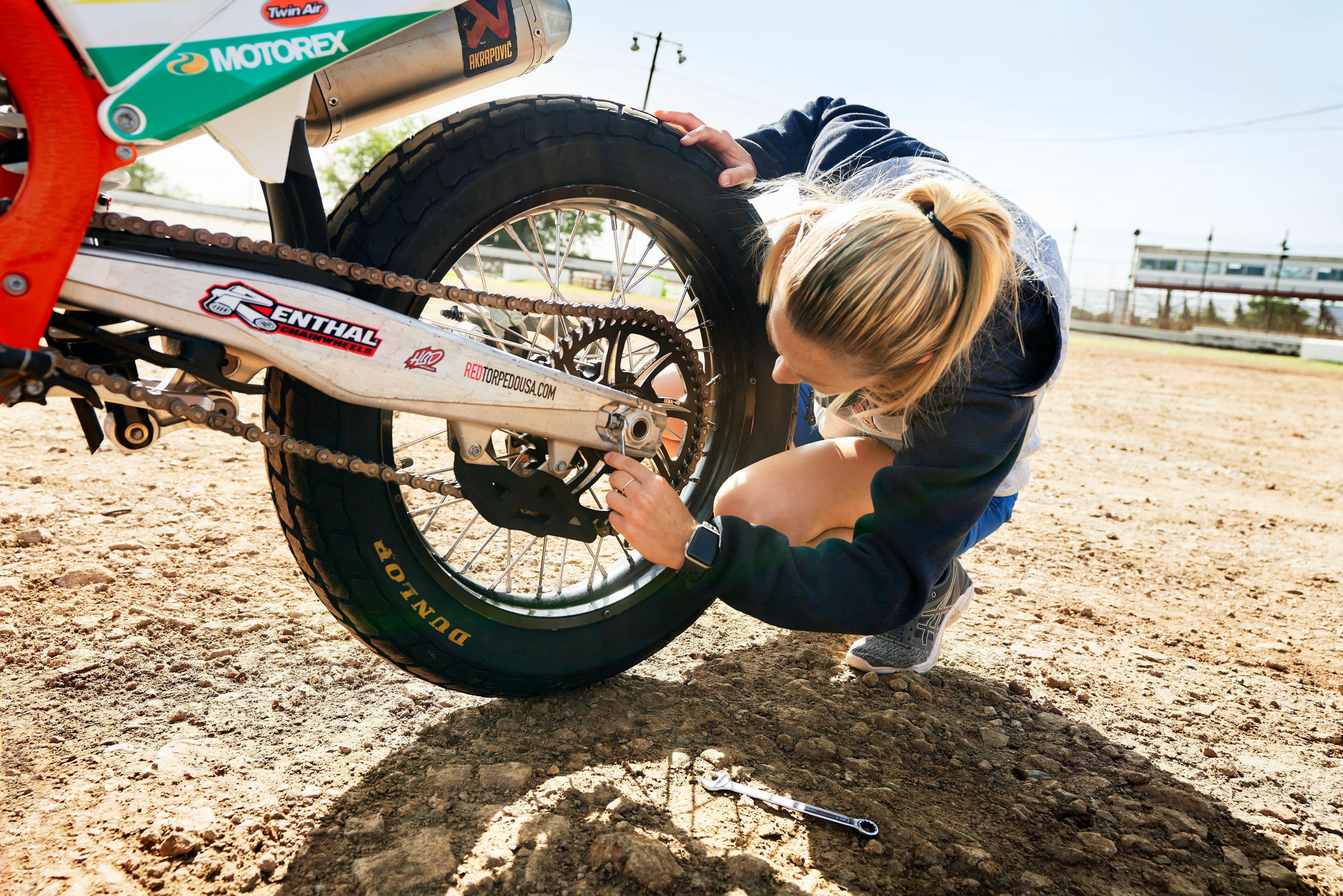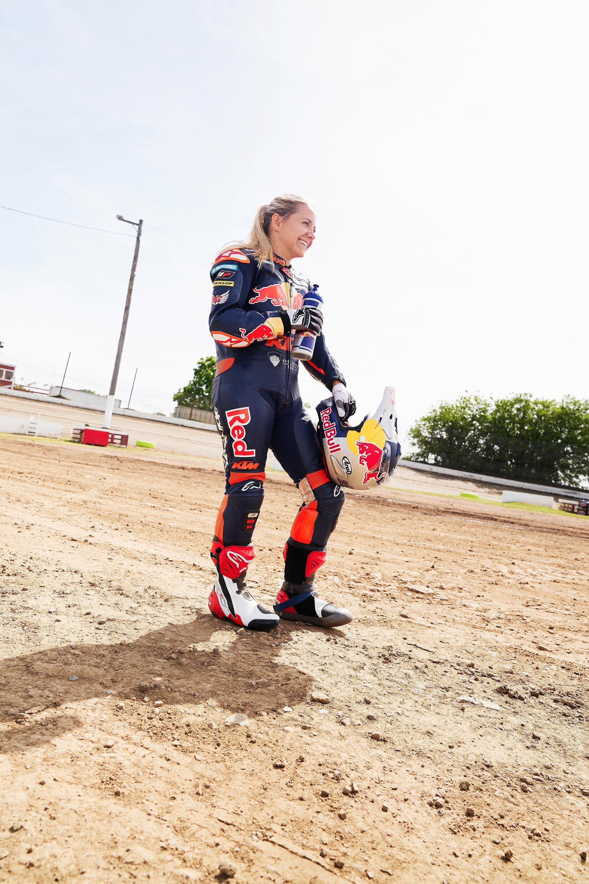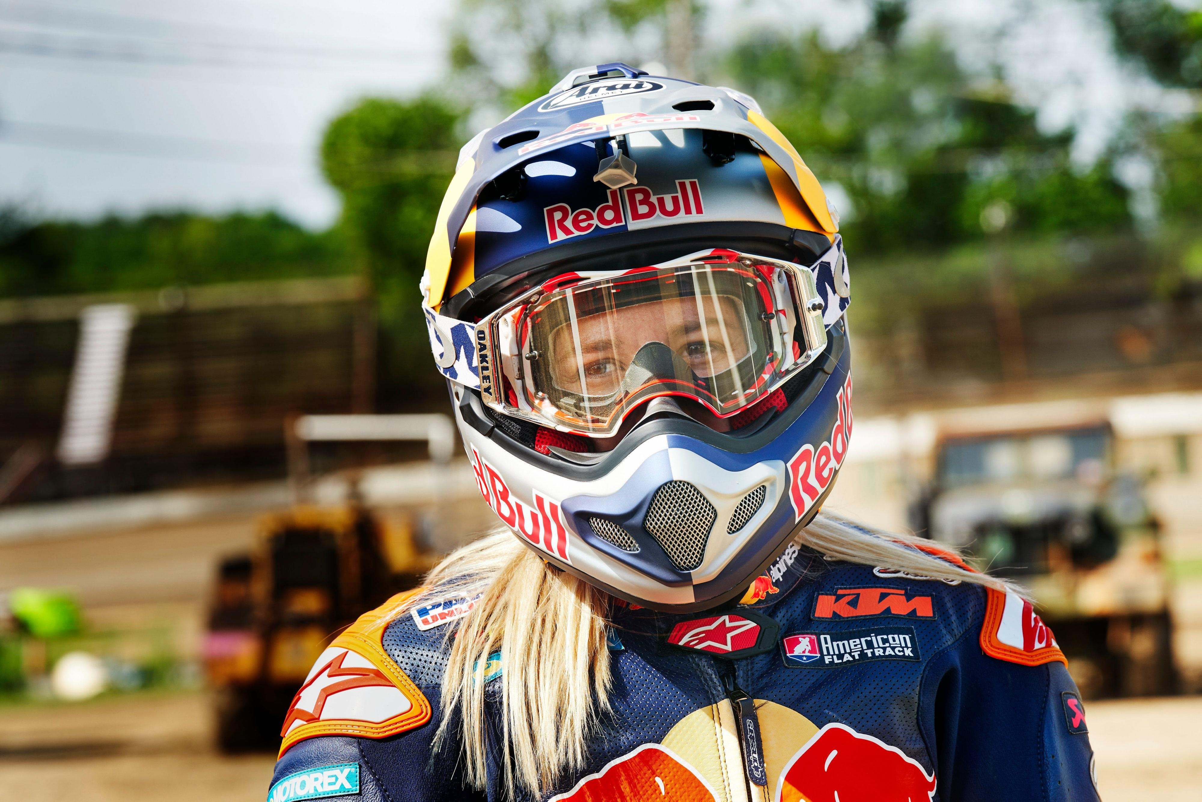 It’s a good story: Shayna Texter is the girl who beats the boys. It’s the one the 28-year-old is accustomed to being told about her, at least. Texter has been called that, and “the face of American flat track,” a gritty discipline of motorcycle racing where riders rage around dirt ovals ranging from a quarter mile to a mile long, powersliding into corners and banging bar ends as they jockey for position. On bikes with rear brakes only, they hit speeds of 120 to 140 mph in the straightaways, up to 90 mph in the curves. Course conditions vary from venue to venue, day to day, even lap to lap. Crashes are common.