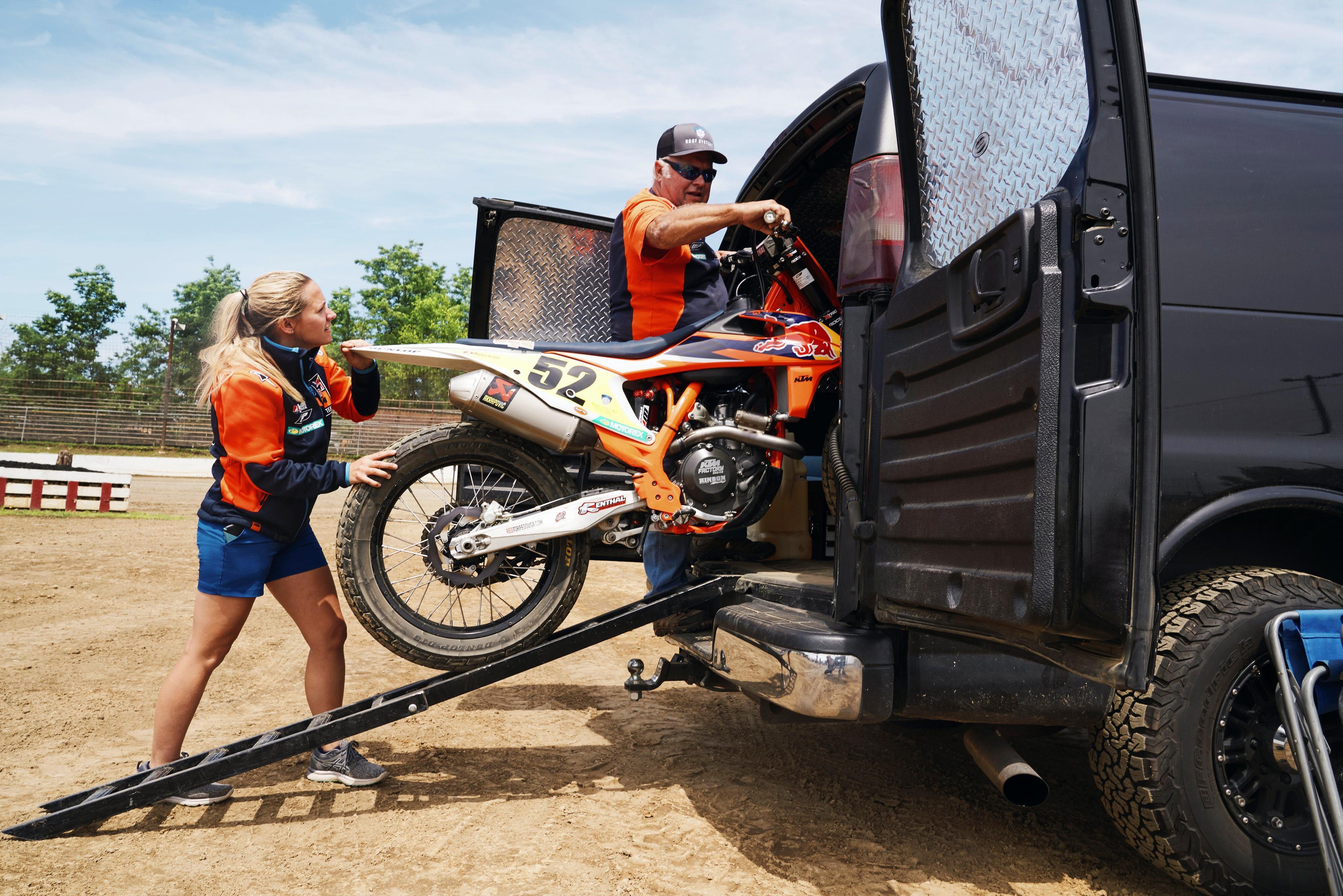 Which is why we’re on our way to a motocross track in Millville, New Jersey, to spend an entire day doing exactly that. On the hour-and-a-half drive, with Briar behind the steering wheel and their friend and fellow racer Jake Johnson riding shotgun, Shayna tells me about how this season she and her team are laser-focused on improving her TTs. She’s working with trainer Aldon Baker, who is known for producing motocross and Supercross champs like Ricky Carmichael. She spent the winter at Baker’s facility in Florida, where he built her a practice TT course. Shayna always did cardio and strength training, but Baker has her on a structured program for the first time, which includes heart-rate-based running and cycling, weight lifting and a nutrition plan that requires her to send him photos of her meals.
