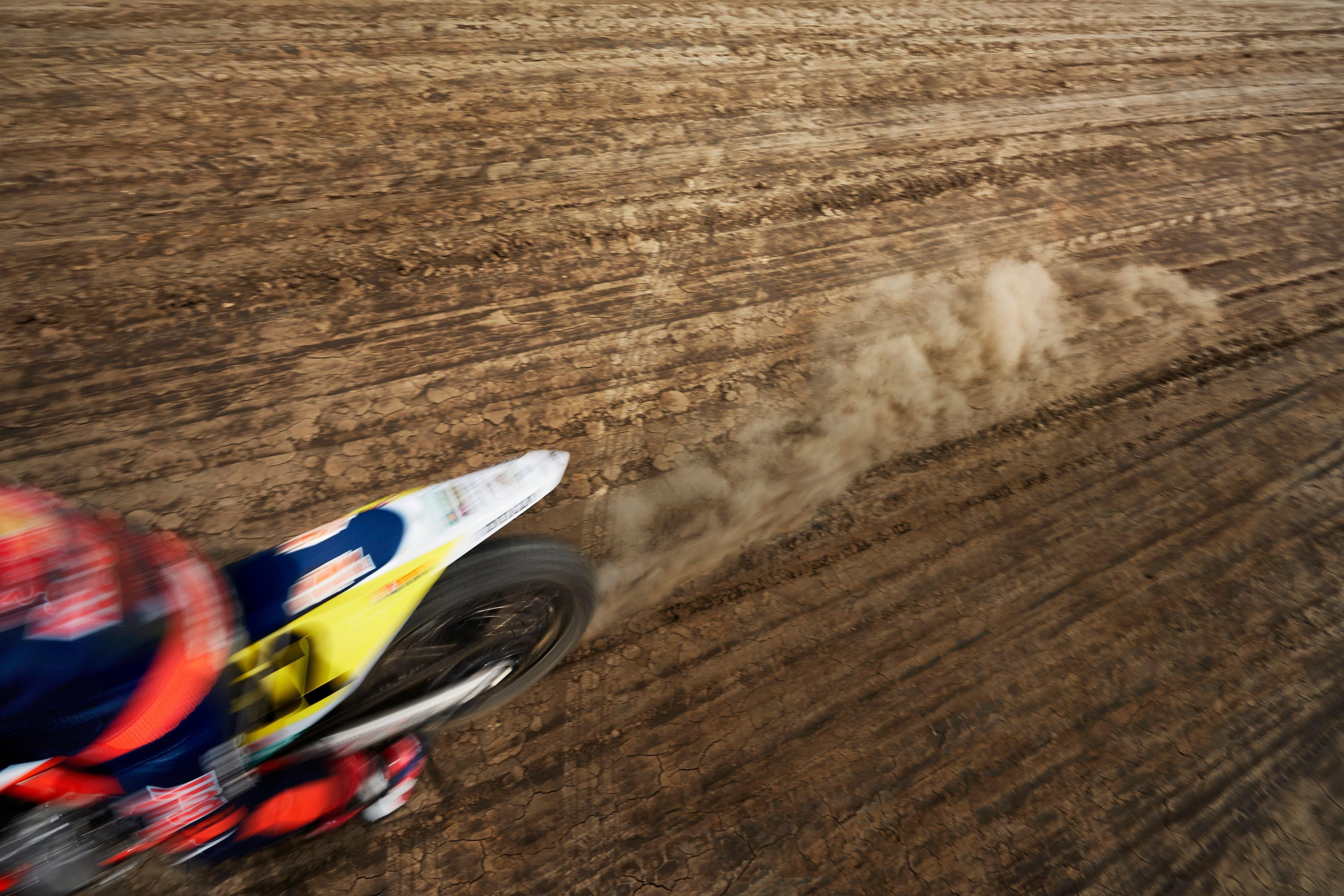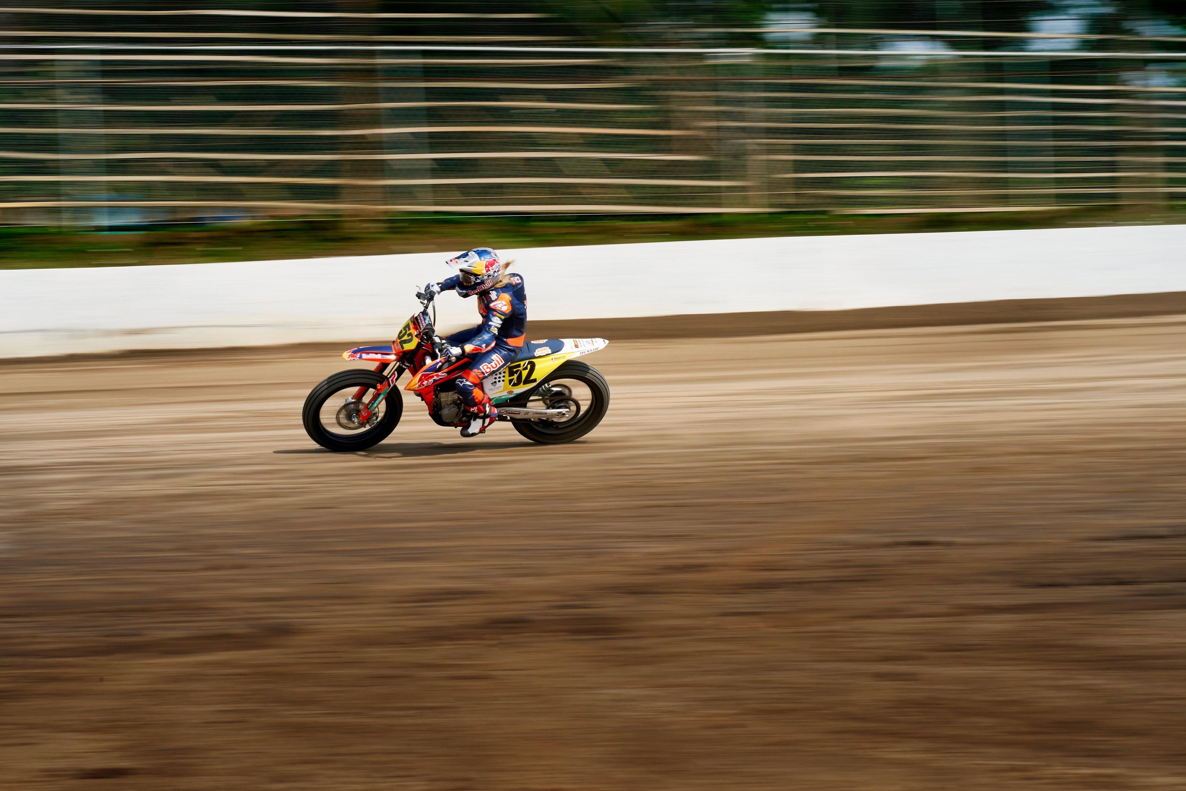 The racers swing wildly into turn three, straining against the g-forces that threaten to pull them into the wall, left feet out, steel soles of their boots sliding across the greasy dirt, heating with friction. But racer 52 swings just a little tighter. For a few breaths, 52 is side by side with the second-place rider, so close they could be touching. But then the orange motorcycle slides ahead.