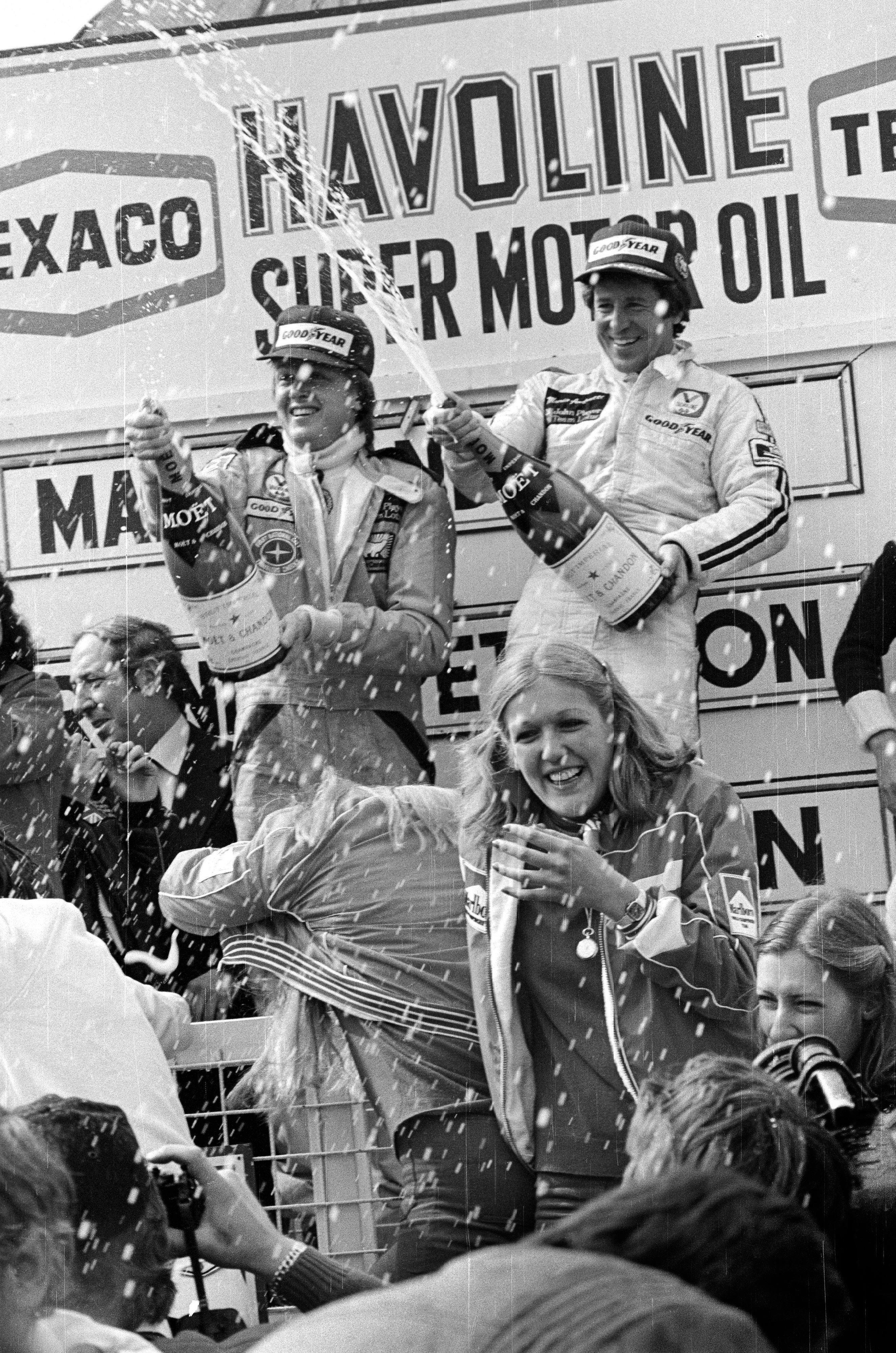 Andretti (right) and his Swedish teammate, Ronnie Peterson, spray onlookers with champagne from the podium after the conclusion of the Belgian Grand Prix on May 21, 1978. Racing for Lotus, Andretti won and Peterson finished second. They repeated that same 1-2 sweep two weeks later at the Spanish Grand Prix, but that September, Peterson died in a crash at the Italian Grand Prix. [RIGHT]