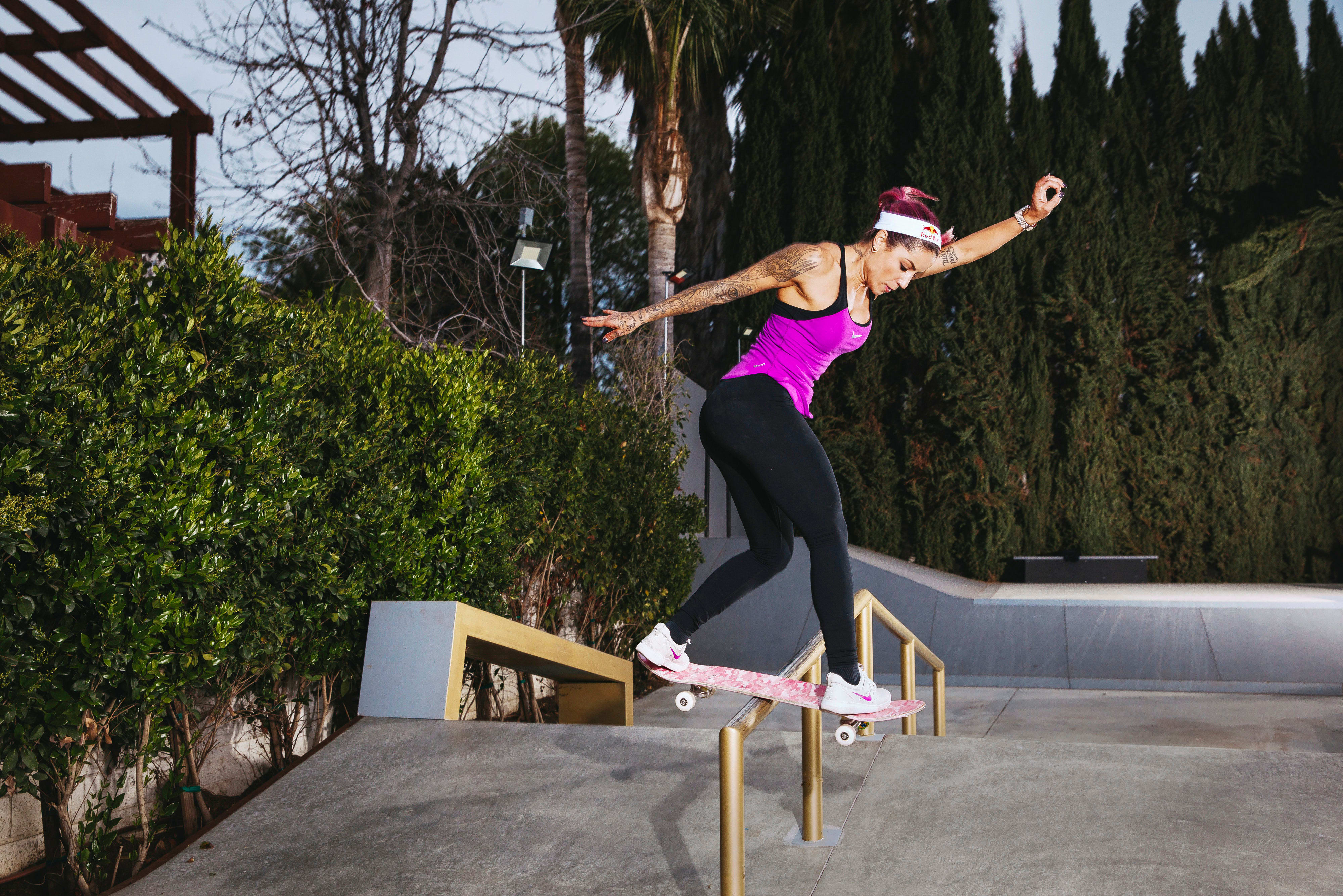 “You can just be creative,” she says. “You don’t have to depend on a wave, you don’t have to depend on snow, you don’t have to depend on anything—you just bring your board and you can skate everywhere you go.”