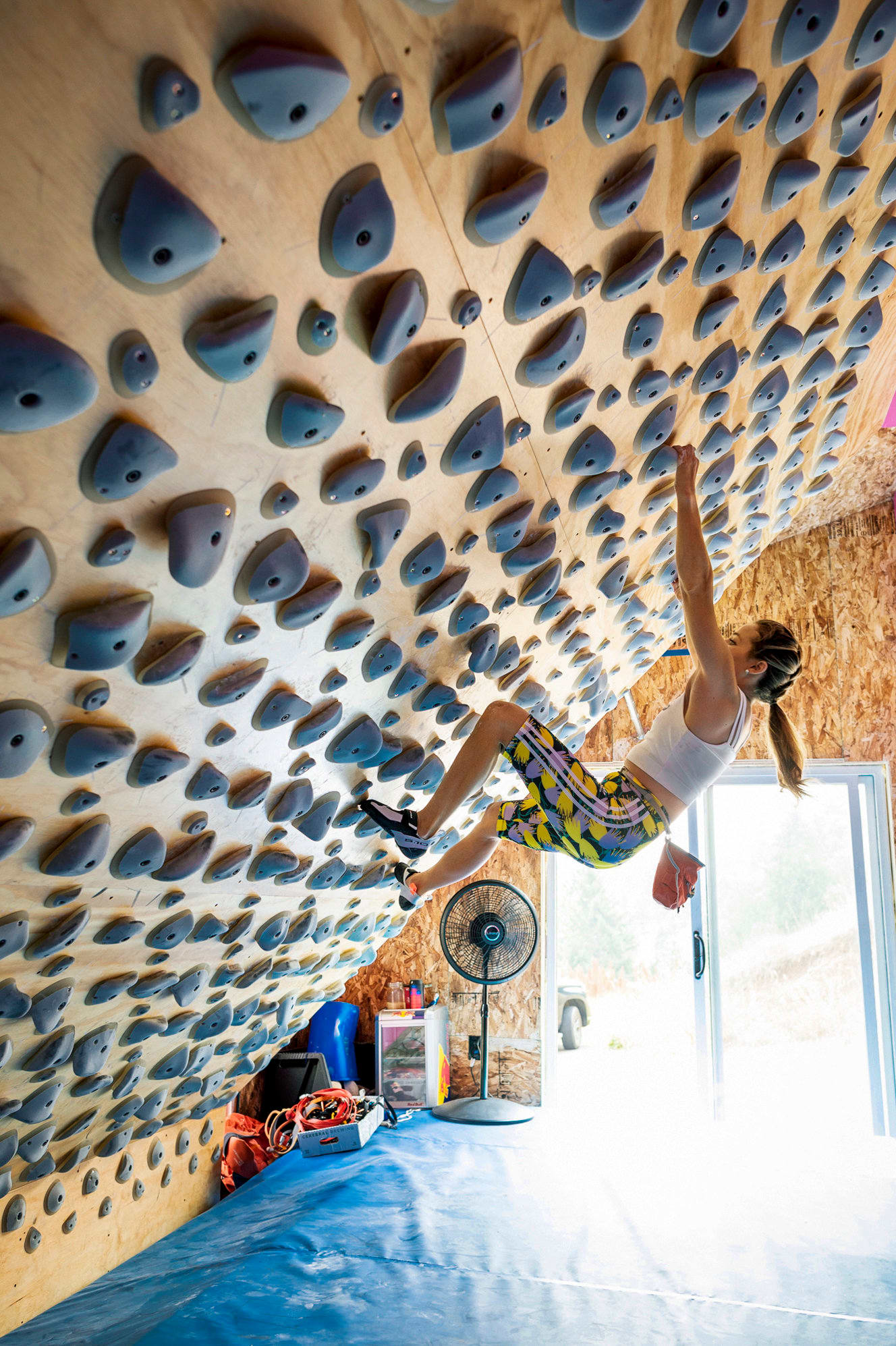Universal gymnastics mats cover the entire floor of DiGiulian’s garage, and climbing holds of various shapes decorate the walls. A campus board, which climbers use to increase finger strength, stands in the middle. “It’s a set of wooden rungs, and you’re supposed to pull your body weight up vertically with the tips of your fingers,” she says. DiGiulian also uses a hangboard, which mounts to the wall and has various ledges that she holds with her fingertips.