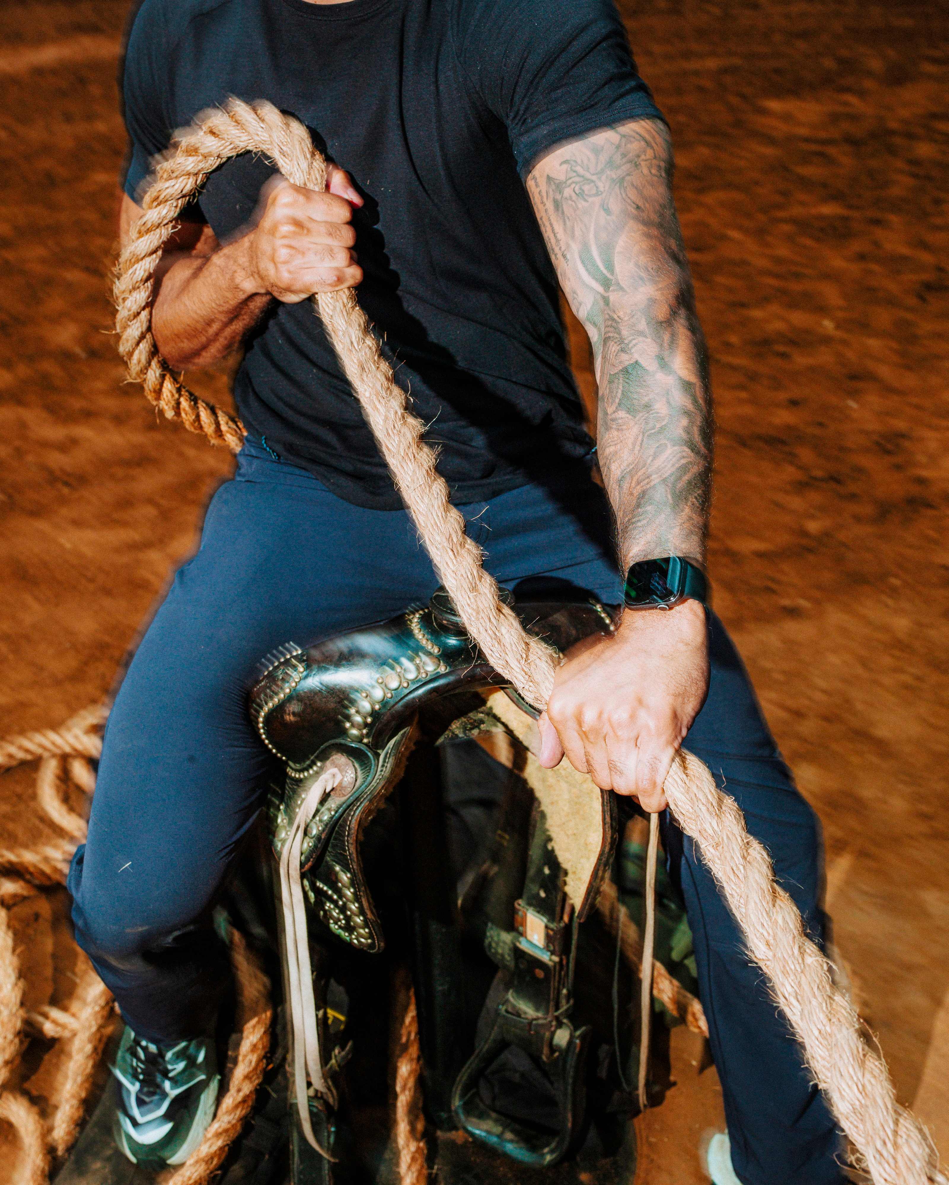 Ohlsen, a self-described “city boy” from Miami, goes next. The 11-time CrossFit Games veteran is tested by the last obstacle, the Bull Pull. “The hardest part is squeezing the saddle,” he says, rubbing his legs. “Using that inner thigh muscle.”