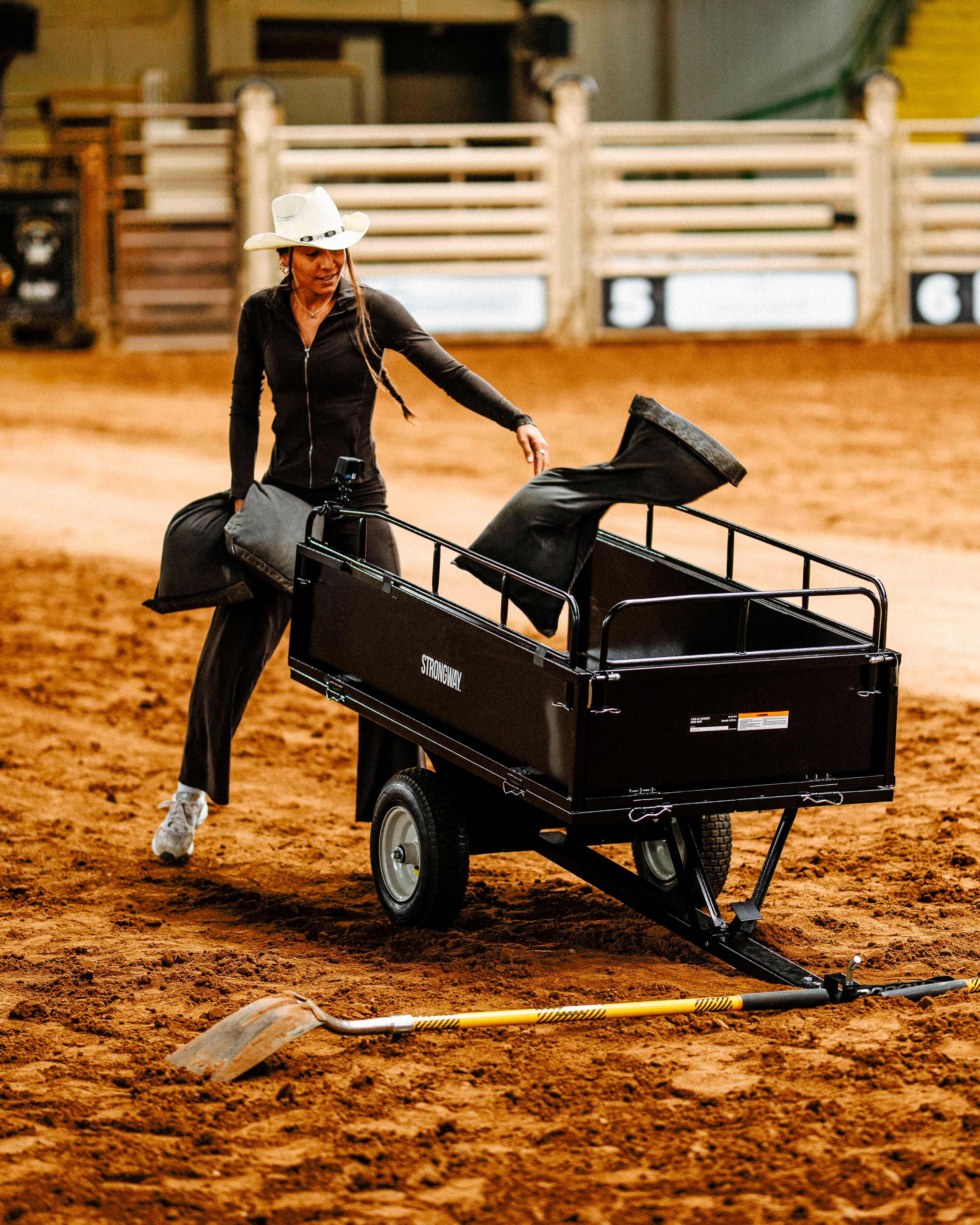 During her run, Nigg is loading the trailer with the 50-pound sacks when it tips and dumps everything back on the arena floor. “Son of gun!” she shouts.
