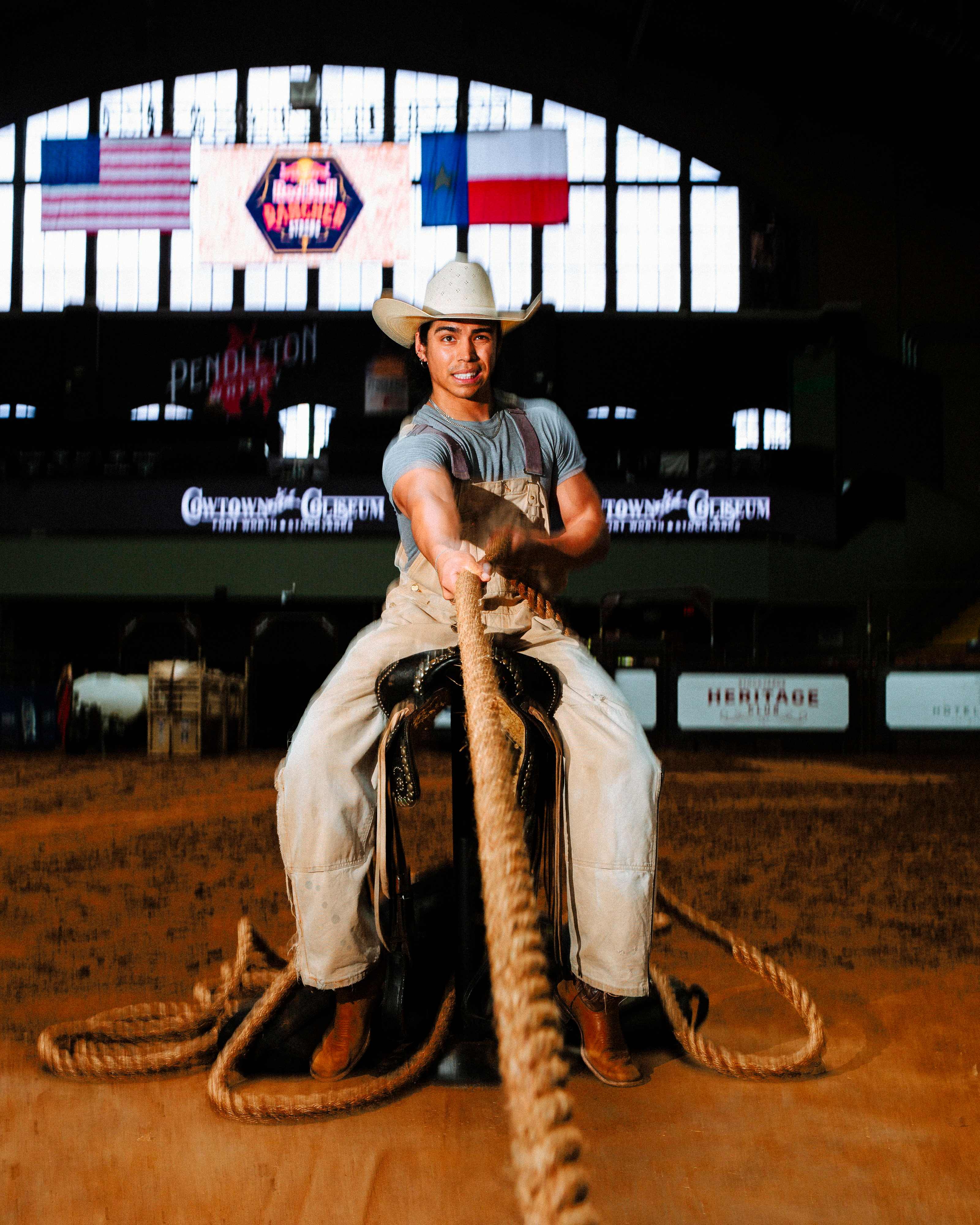The Cowboy Ninja wears a black hat, brown work boots and blue jeans. Running through the soft dirt spread across the arena floor at the Cowtown Coliseum in Fort Worth, Texas, he leads a reporter through four obstacles being tested in the lead- up to a new, one-of-a-kind event called Red Bull Rancher Strong.