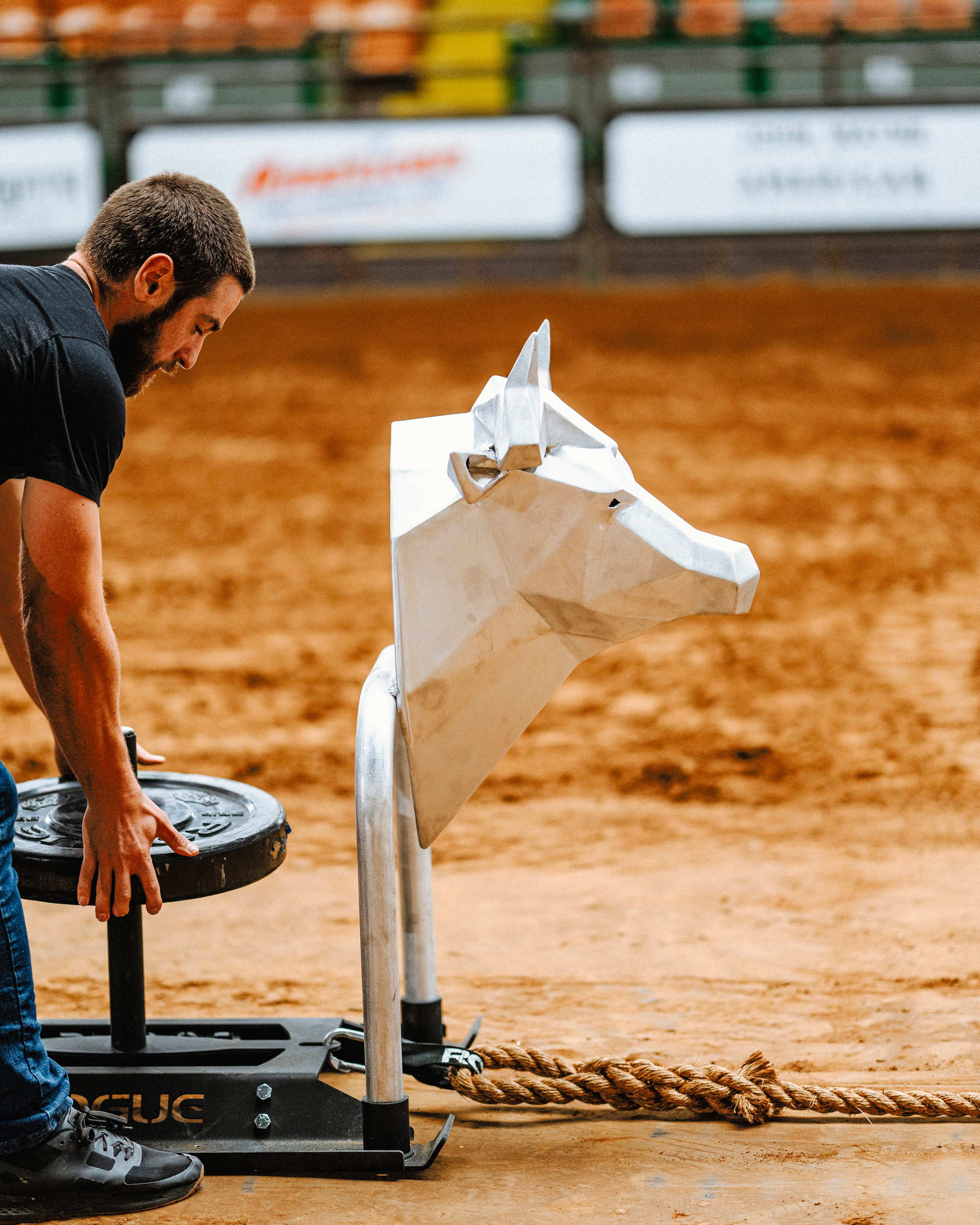 Finally: “It’s time to bring in the bull.” He hops onto a Western saddle firmly mounted on a pedestal, grabs hold of a thick rope and pulls in a weight sled with a custom-welded bull’s head. After patting the bull’s head, Pekus dismounts the saddle and runs off the arena floor, leaving a plume of dust in his wake.