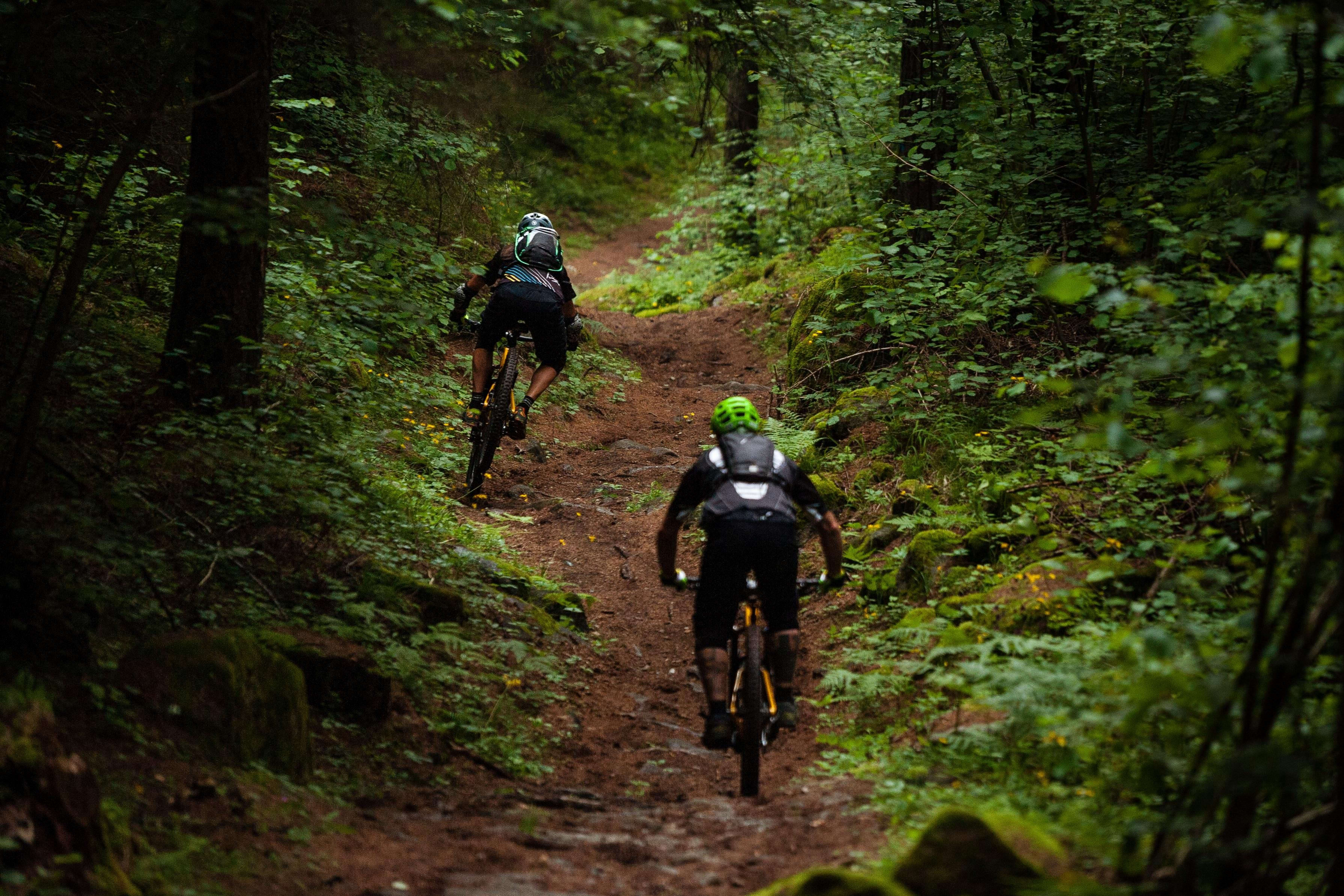 The first part is an easy gravel road with great panoramic views. The second part through a conifer forest is a fun natural trail with some small man-made features. The trail is good for intermediate as well as for experienced riders.