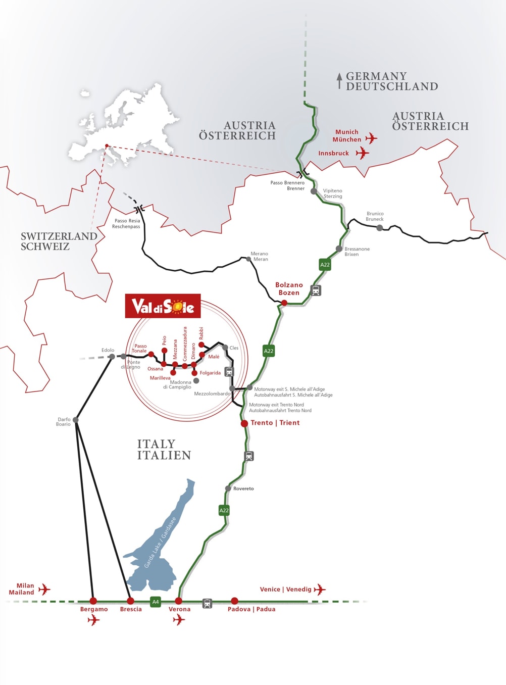 Val di Sole is situated in northern Italy and has good transport connections to Milan, Bologna, Venice and Innsbruck.