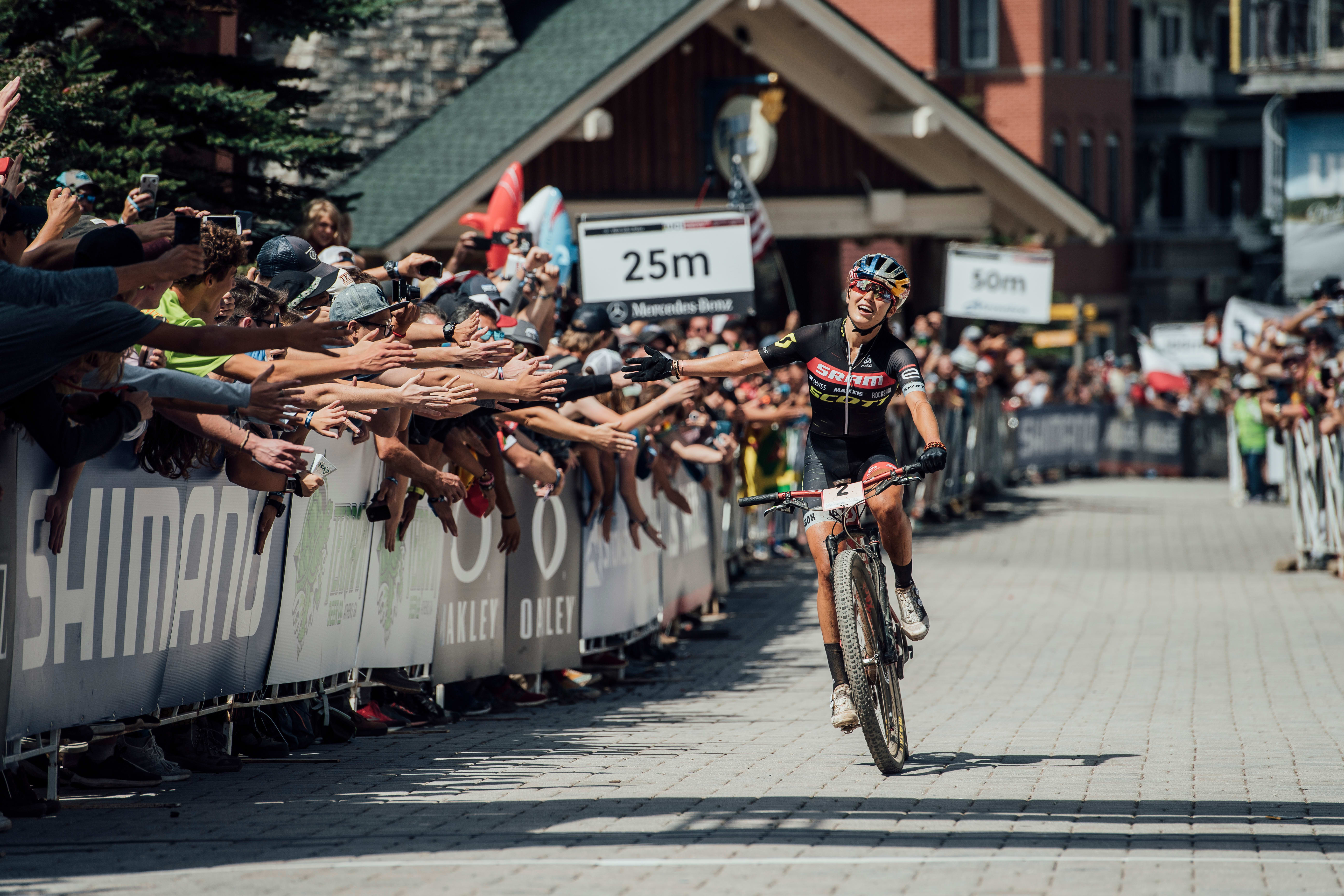 Kate Courtney crosses the finish line and thanks fans at the UCI XCO World Cup in Snowshoe, USA on September 8, 2019