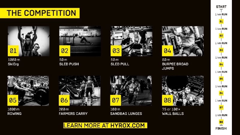 Here's a breakdown of a HYROX race structure: