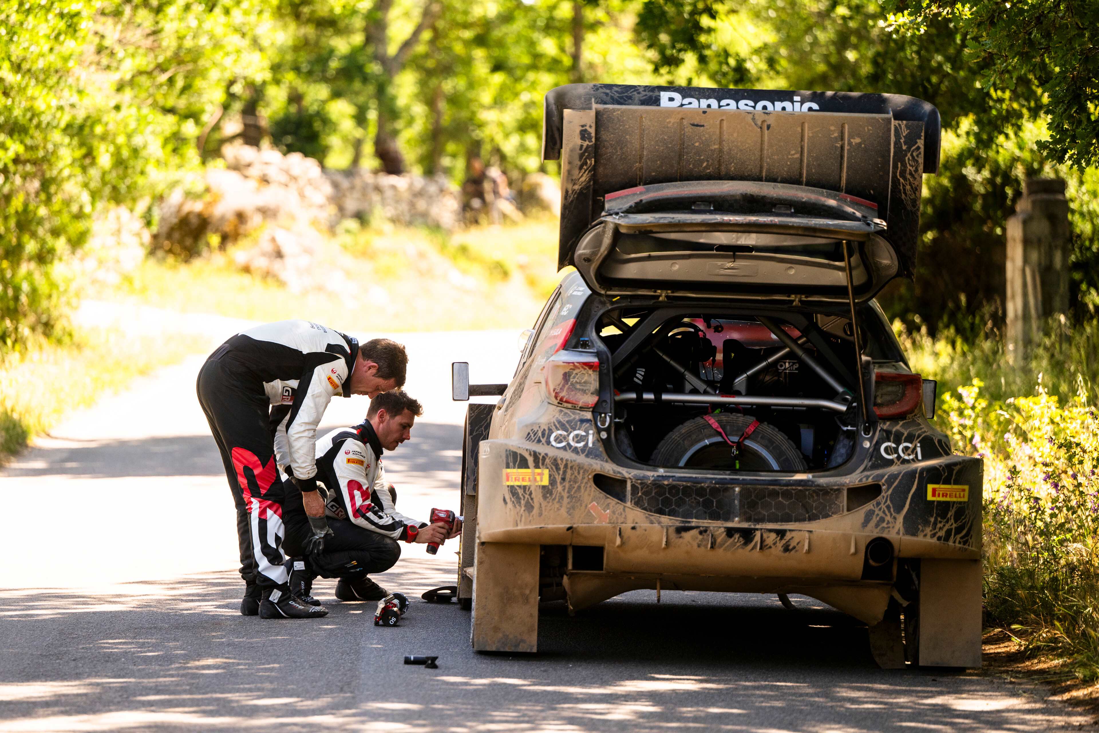 Running repairs: Sébastien Ogier and Vincent Landais replace a tire
