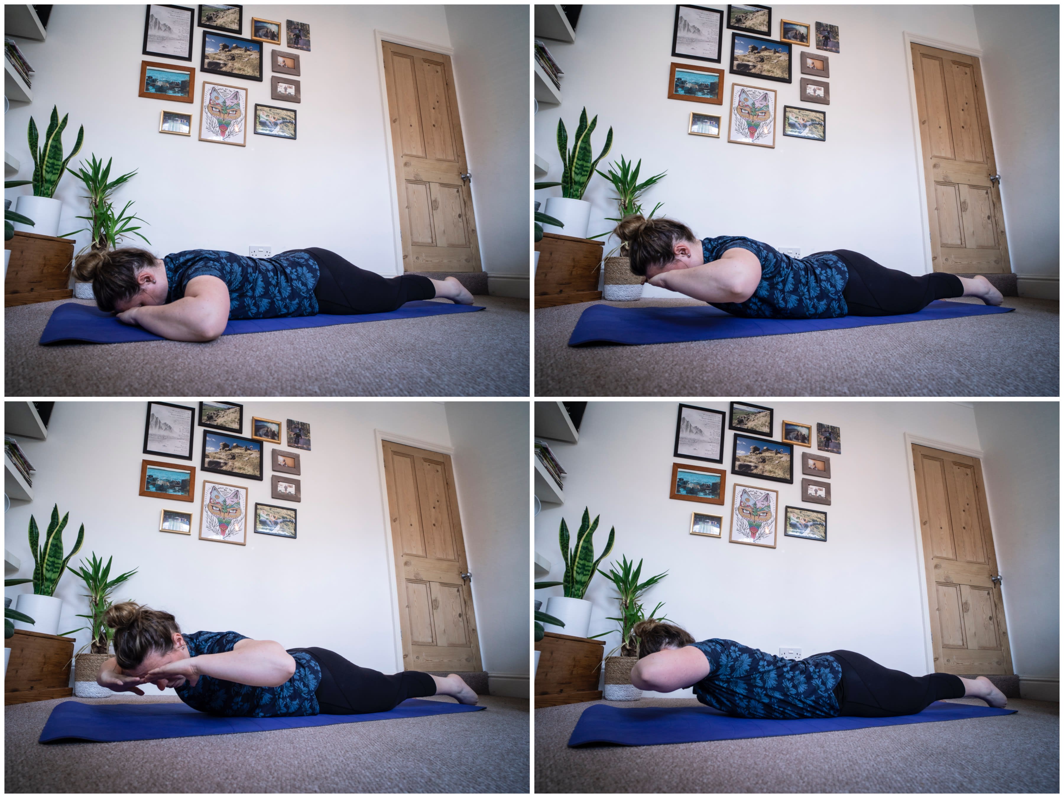 - Lie on your front, hands under your forehead.