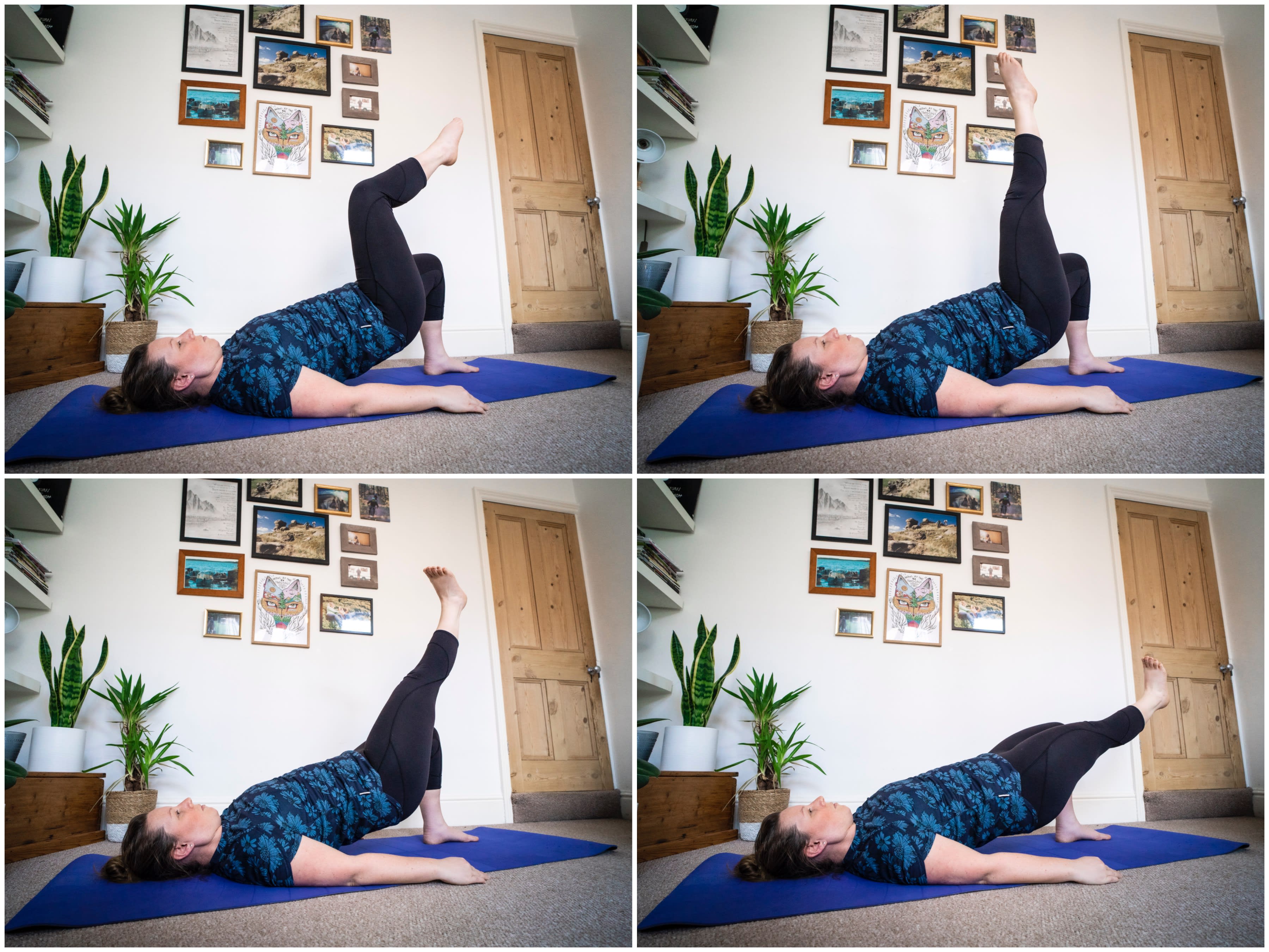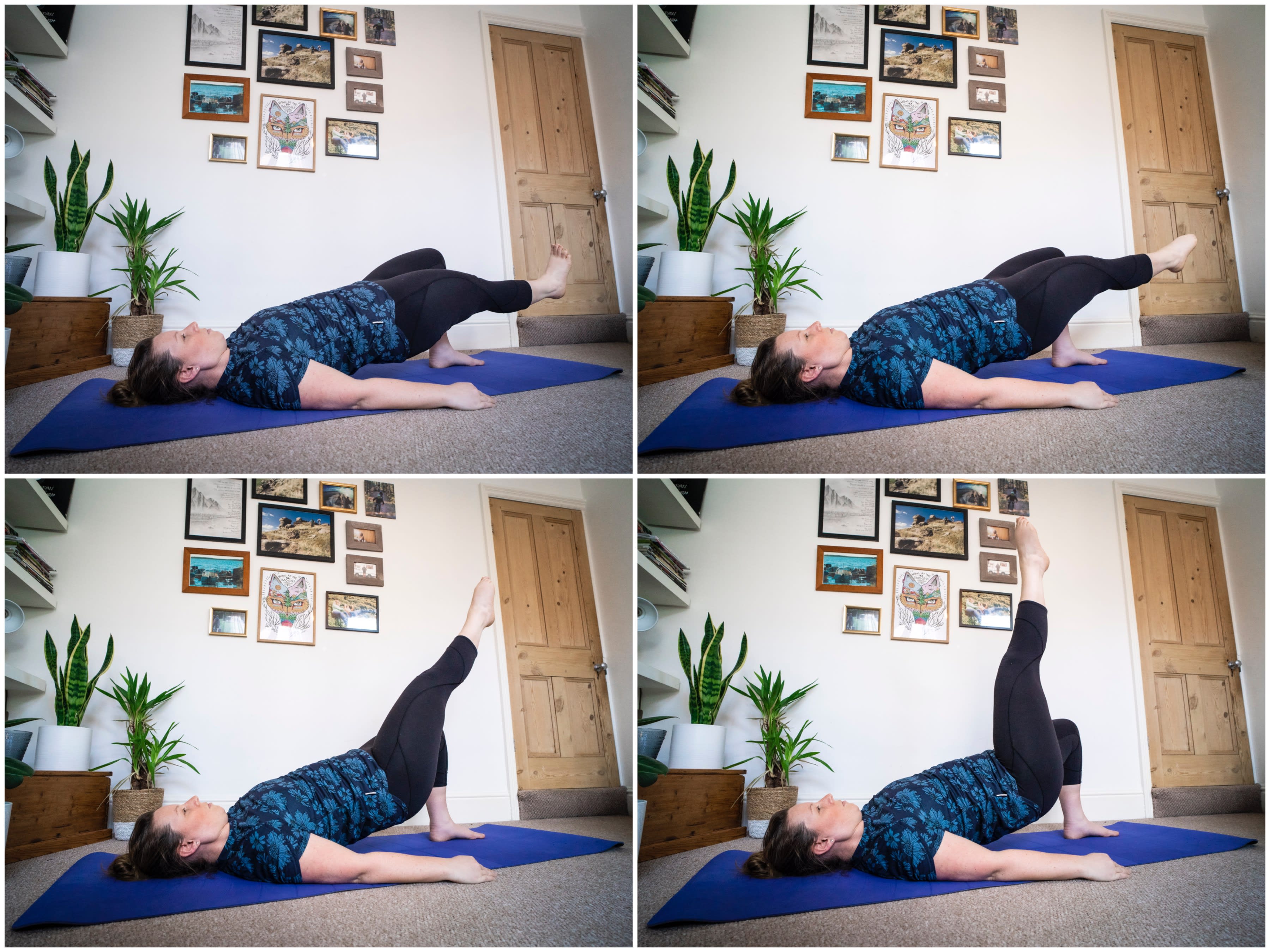 - Breathe in and lower the straight leg towards the floor. Remember to relax the shoulders and to keep the core activated, pelvis pressing upwards.