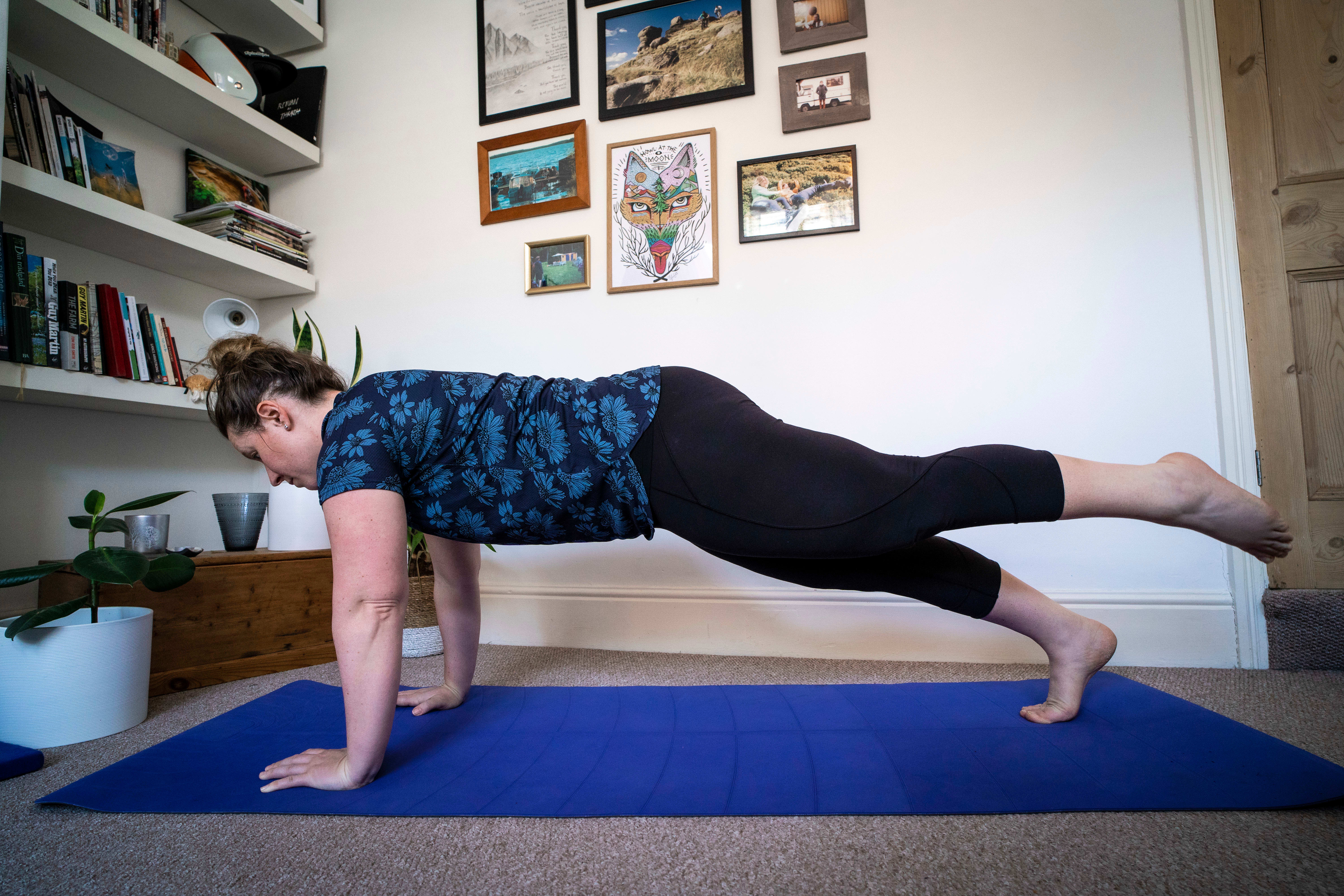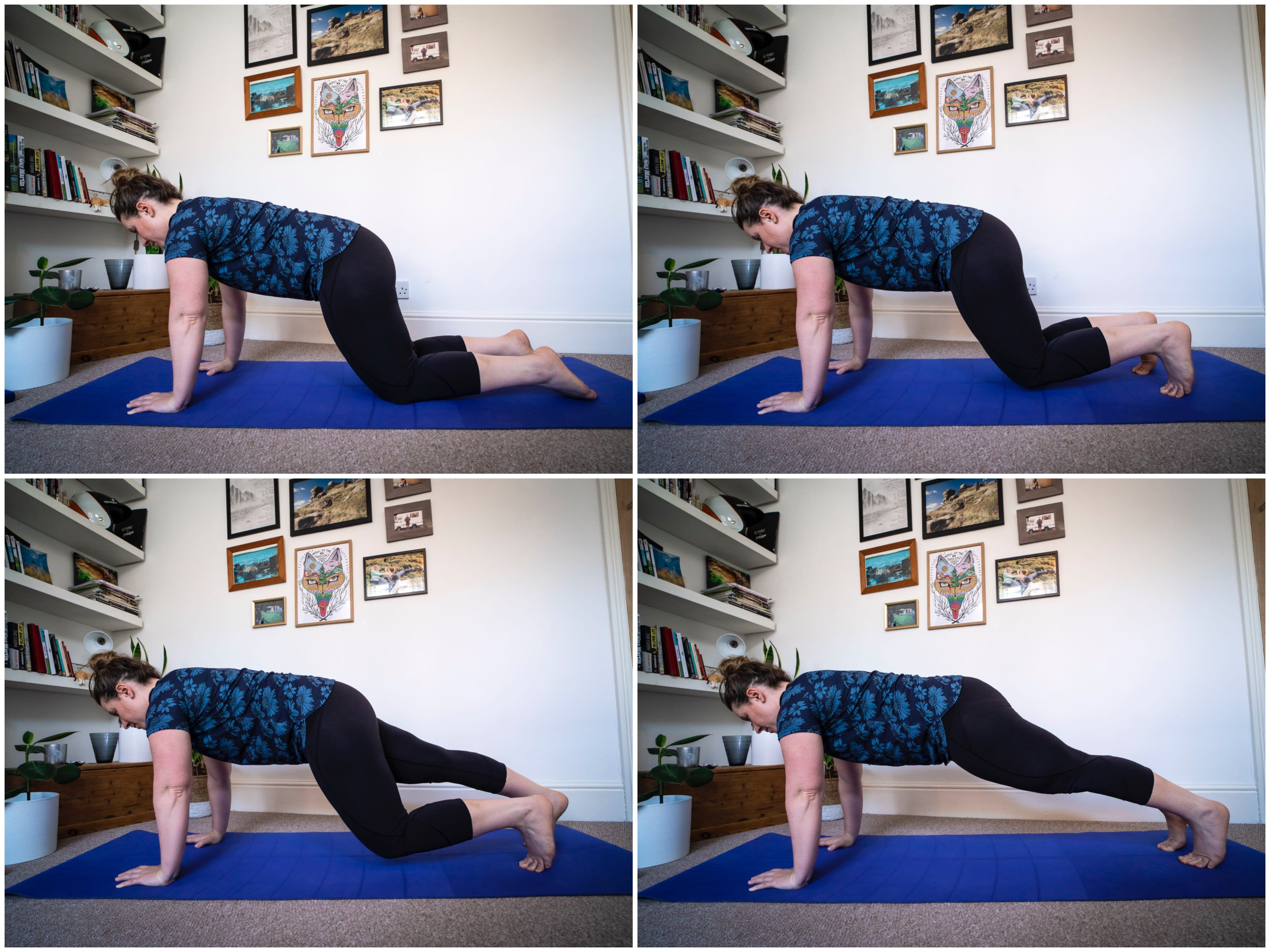 - From here, keeping the same alignment, stretch one foot out at a time until you are in a full plank. Your hips and bum shouldn’t move during this.