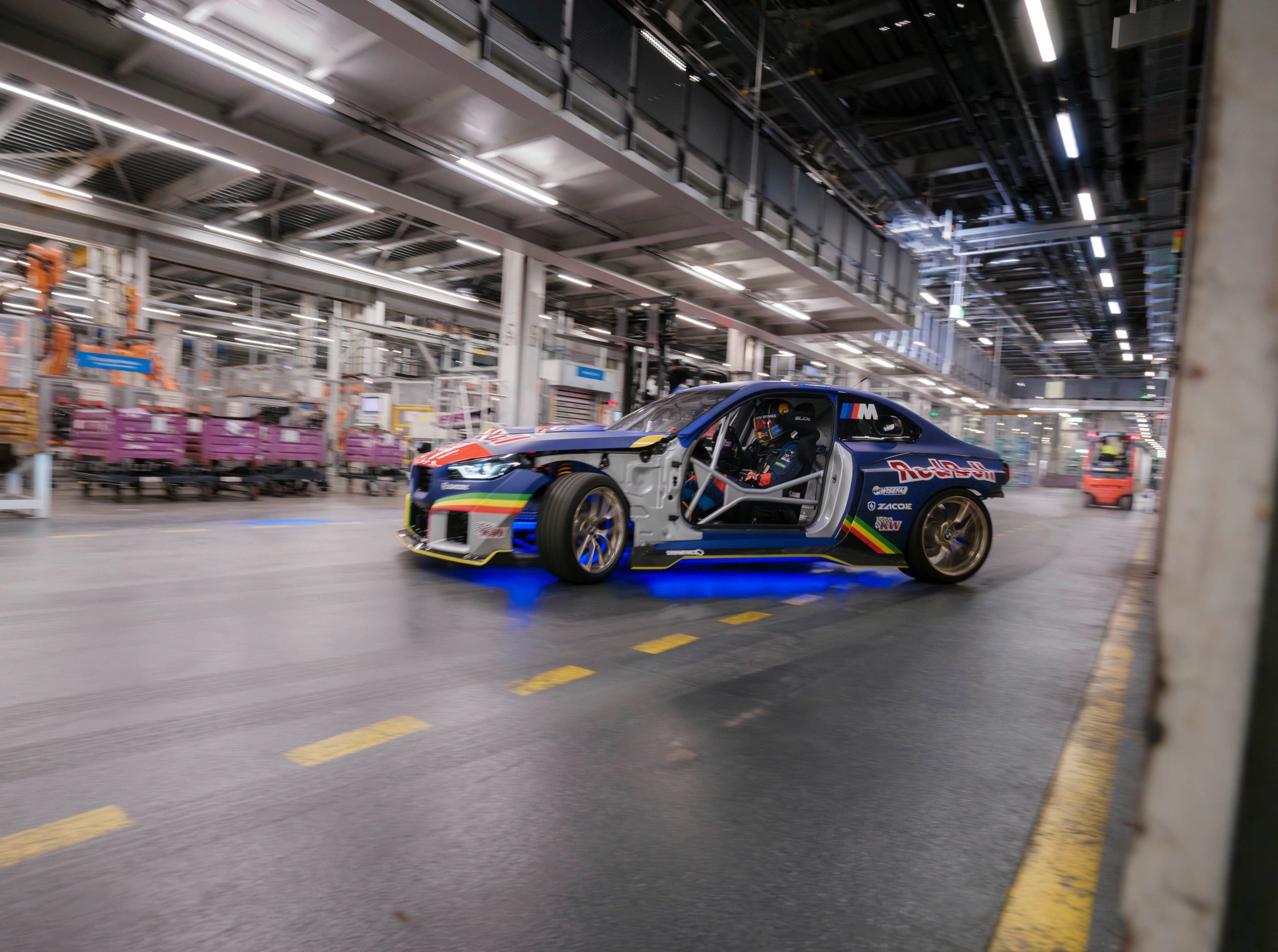 Drifting through the BMW plant in Munich in a brand-new 1100 hp competition car, where precisely calibrated robots and state-of-the-art equipment line the track instead of contact-tested curbs and gravel... Unimaginable. Until someone does it.