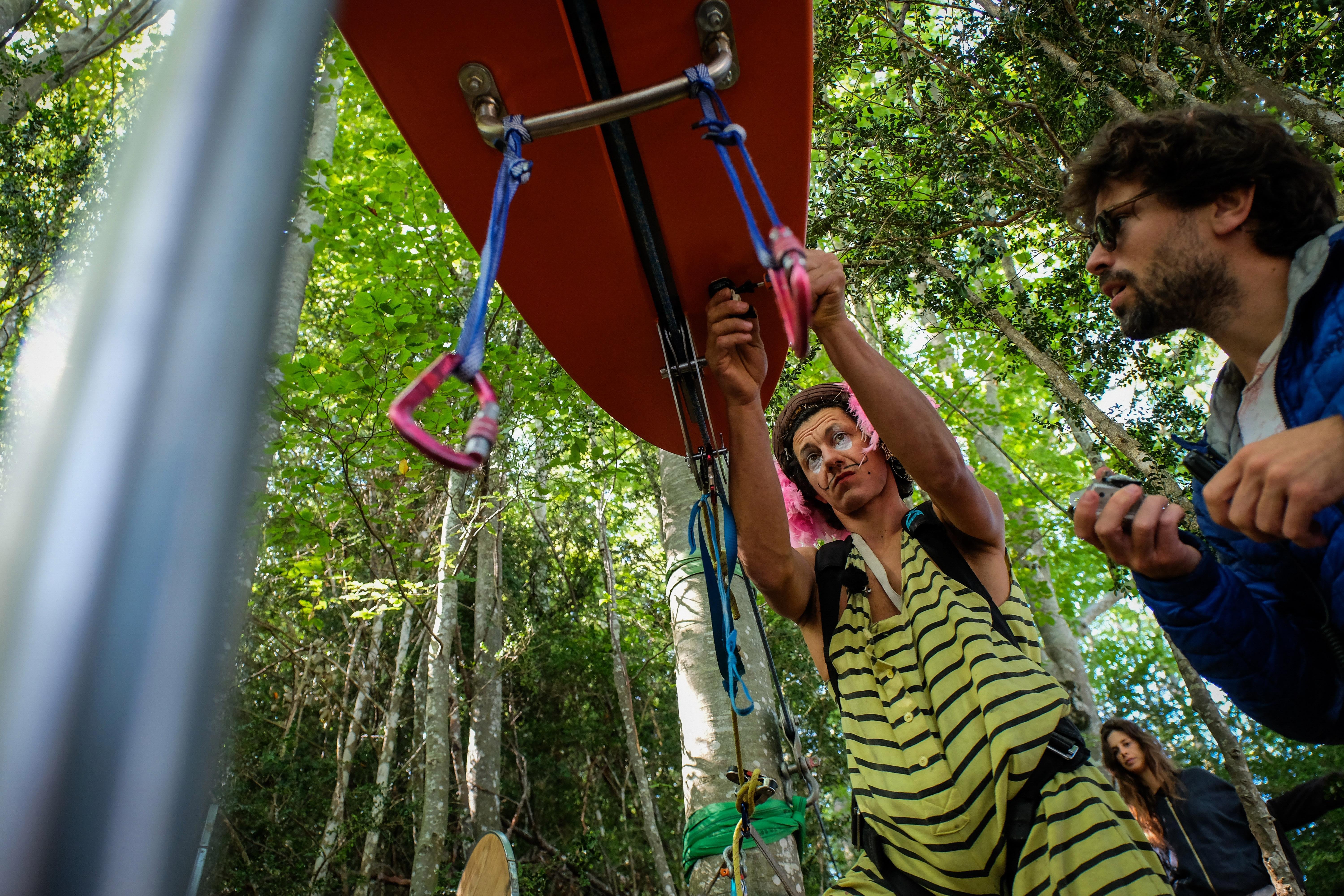 Yes. For me, it really was when I met Tancrède Melet [the French tightrope walker who died in January 2016 while preparing for a show]. When I met him, I was just starting to learn how to BASE-jump and he was doing a lot of highline and skydiving. He had more of a sport-oriented approach, but was multidisciplinary, a bit like me. So when I came in to his group, I brought the scenarios and characters layer. In this whole mix of sports, I added a cartoon-ish universe, creativity and a will to try to not only use sports that already exist, but to try to invent things to have fun with it. So an idea like this one and the catapult actually happened during frenzies, in the car and such.